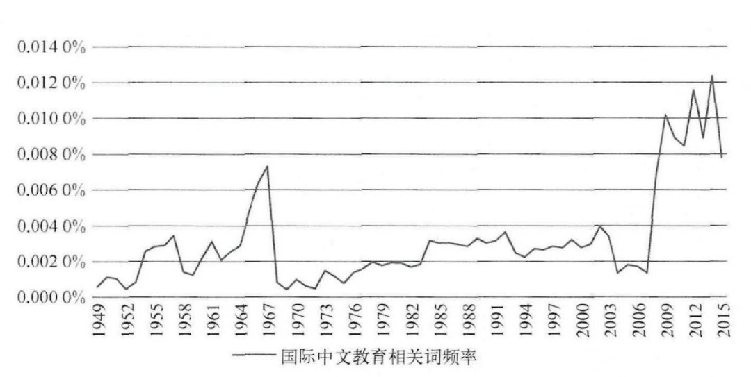 中华人民共和国成立以来,与国际中文教育相关的中心词所占频率大幅上升,均高于0.0015%,中华人民共和国成立初期至改革开放前夕更是在0.0020%以上。这段时期,受稳定的政治局面和社会环境以及学科发展需求的影响,汉语作为第二语言的教学逐渐发展起来,并在20世纪80年代成为一门独立的学科,蓬勃发展起来。不同于近代的军事动因、宗教动因等,现当代国际中文教育事业发展动因是多方面的,总体来看主要是文化动因和经济动因。
