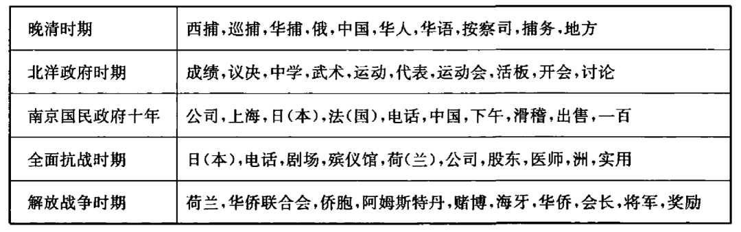 “学华语”仅在近代5个时期的《申报》语料中有高频共现词,在中华人民共和国成立以后的《人民日报》中几乎很少出现,没有抽取到共现频次大于10的高频共现词。近代,与国际中文教育相关词高频共现的主要与官职、官僚机构、商业以及外国有关。北洋政府时期还出现了与“体育”“中学”有关的词,主要是由于这一时期汉语教学与学习集中于各中学。北洋政府时期是我国社会现代化的早期阶段,这一时期体育教育也得到了一定的发展。当时存在两个具有实际效力的教育宗旨,第一个是1912年9月2日由教育部颁布的军国民教育宗旨,第二个是1919年由教育调查会提出的健全人格教育宗旨。解放战争时期,与荷兰及华侨相关的词占据大部分,主要是由于这一时期荷印政府以及学校,民间有注重中文的倾向,且荷兰及荷属东印度华侨众多,但华侨中颇多不识中文者又无机会学习中国历史与文化。此外,这一时期除了实用交际,对于中国及汉语汉学的学术研究也是学习汉语的目的之一,如1947年荷印政府筹备成立中国学术研究所作为东印度研究中国学术与文化之中心,巴达维亚大学之文学部科目中也有中国学一门。如: