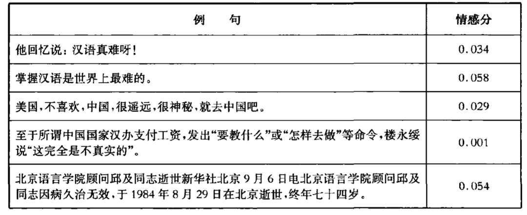 值得讨论的是,《人民日报》是作为中国的中央机关报,承担宣传责任,然而在数据统计中出现部分负面情感。本文以改革开放以来至今的数据为例进行探究并分析解释。改革开放以来至今与国际中文教育有关的例句及其情感分如表5所示,