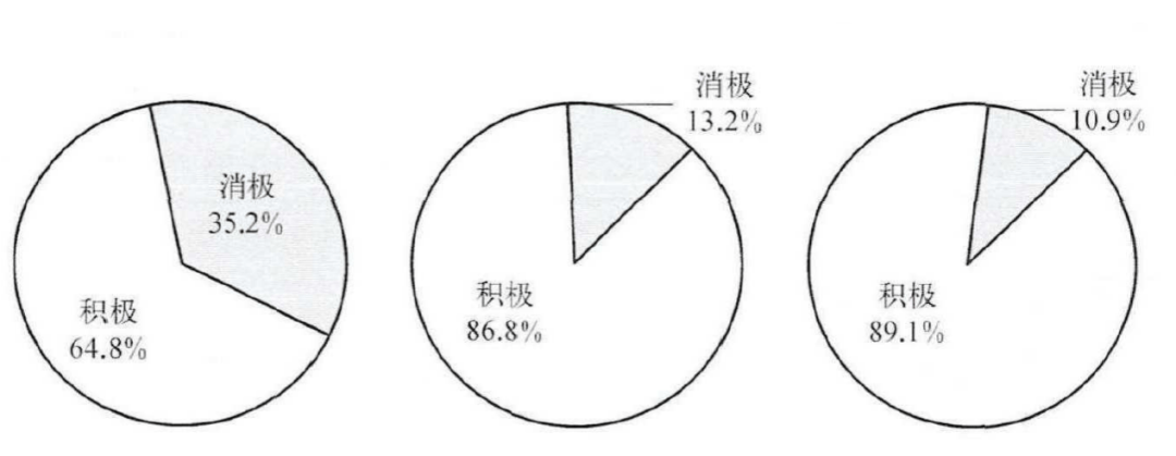 晚清时期,与国际中文教育有关的例句共抽取196条,北洋政府时期共抽取2142条,改革开放以来至今共抽取15269条,例数量的显著差异与国际中文教育在不同时期的发展程度相契合。一个学科在不同的历史时期发展状况不同,学科形象自然也会随之变化。图5的饼图是积极情感例句与消极情感例句在不同时期的比重变化,晚清时期以后积极情感所占比重一直遥遥领先于消极情感所占比重,且总体呈平稳趋势。