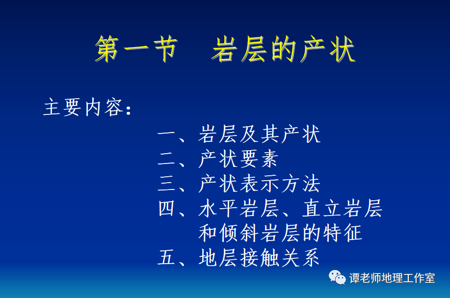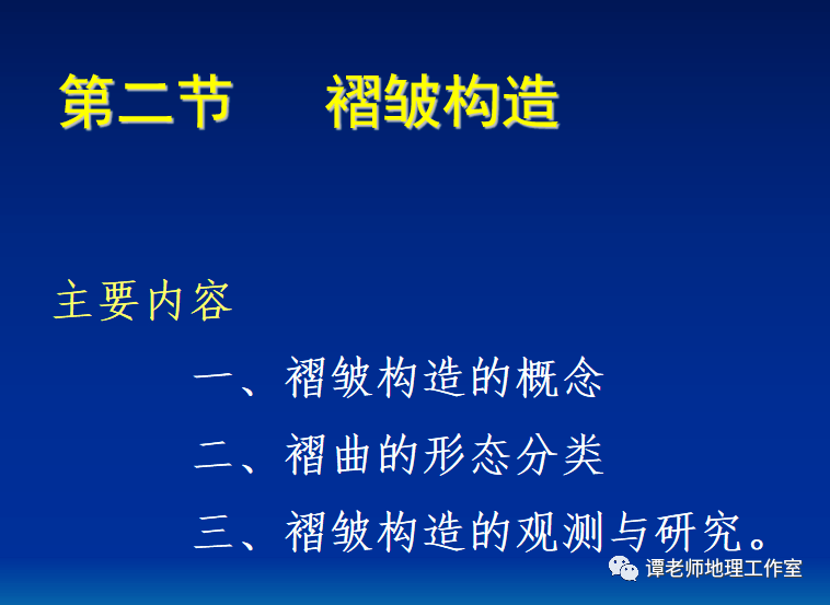 1. 新老岩层依次对称重复出露是判别褶曲存在的基本标志。但水平构造、单斜构造地区由于地形切割也会出现这种现象。