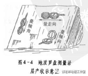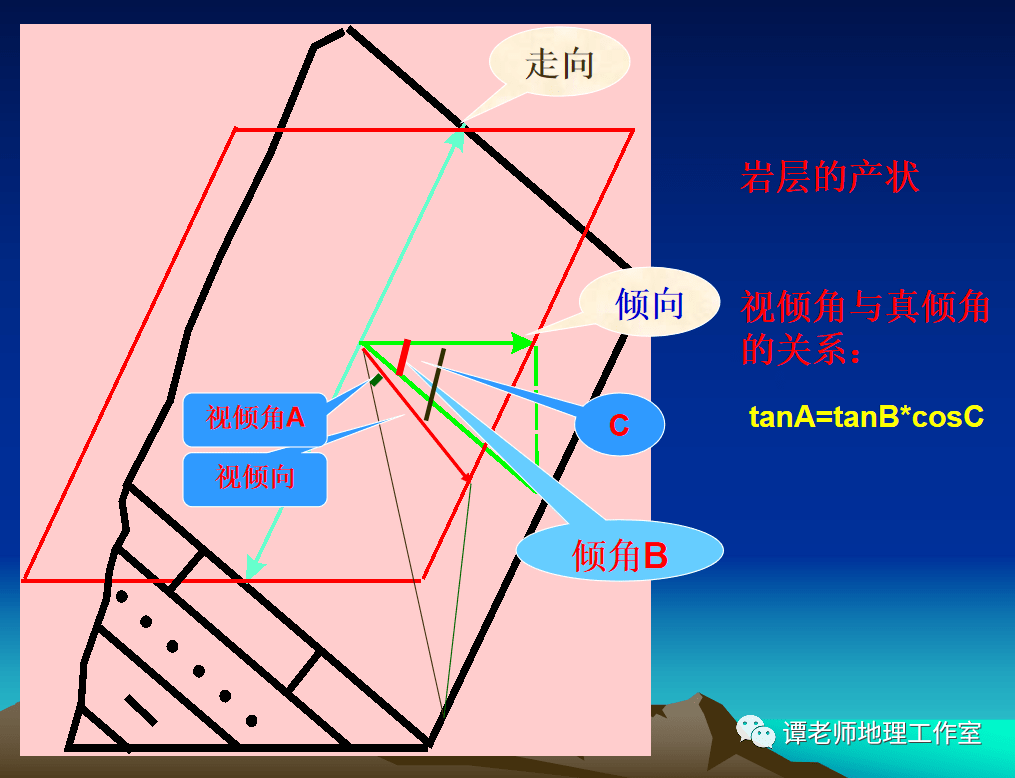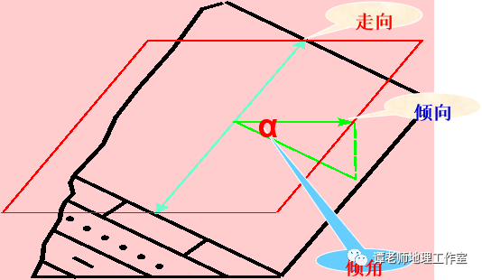 2、倾向:在岩层面上沿岩层面的倾斜方向垂直走向的直线称倾斜线。倾斜线在水平面上的投影线所指的岩层面倾斜方向称倾向。
