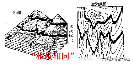② 当岩层倾向与地面坡向相同且岩层倾角大于地面坡角时,岩层界线与地形等高线呈相反的方向弯曲: