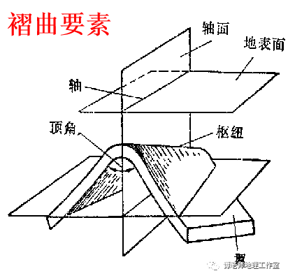 3. 枢纽点和枢纽线:同一褶曲横剖面上同一岩层面的最大弯曲点枢纽点;同一褶曲横剖面上同一岩层面的最大弯曲点的连线叫枢纽线. 轴面和轴迹:同一褶曲各岩层面上枢纽线构成的面叫轴面。轴面与水平面的交线.顶角和翼角:两翼同一岩层之间的夹角叫顶角。两翼岩层与水平面夹角叫翼角。