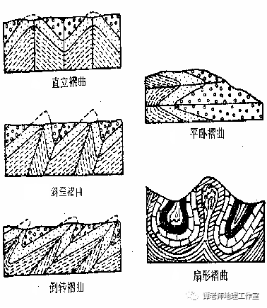 1. 水平褶曲:轴面枢纽近于水平,褶曲沿水平方向延伸,两翼岩层走向大致平行。