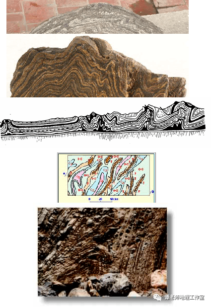 3. 牵引褶皱:断层两侧岩层因牵引而出现弯曲,弯曲突起方向指示本盘运动方向。