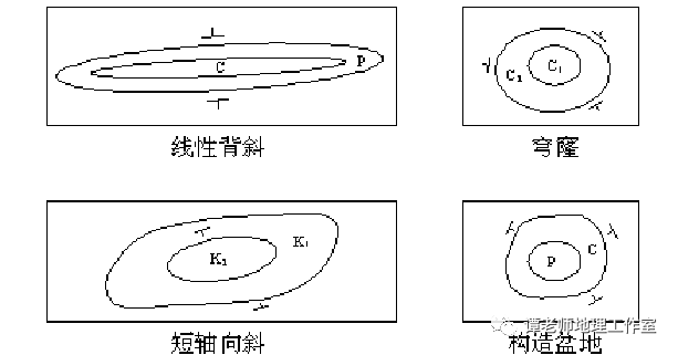 3. 近等轴褶曲:其枢纽、轴面、轴迹无定向,平面呈近圆形,近等轴背斜又叫穹窿,近等轴向斜又叫构造盆地。