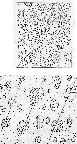 2. 断层角砾、断层泥:保留在断层带内煤屑、岩块只能分布在曾位移的那段距离内,且愈远粒度越细、数量越少。