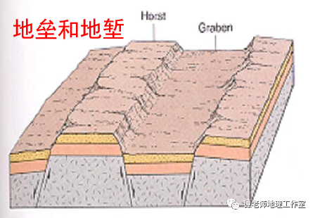 ①地垒和地堑:两条以上正断层,倾向相背、中间断盘相对上升称地垒。反之,断层倾向相对、中间盘下降称地堑。