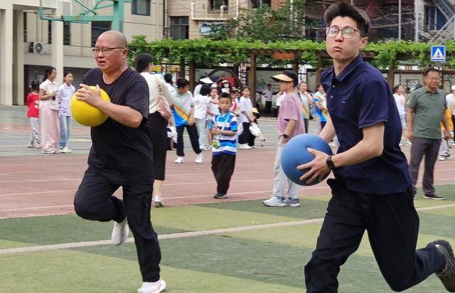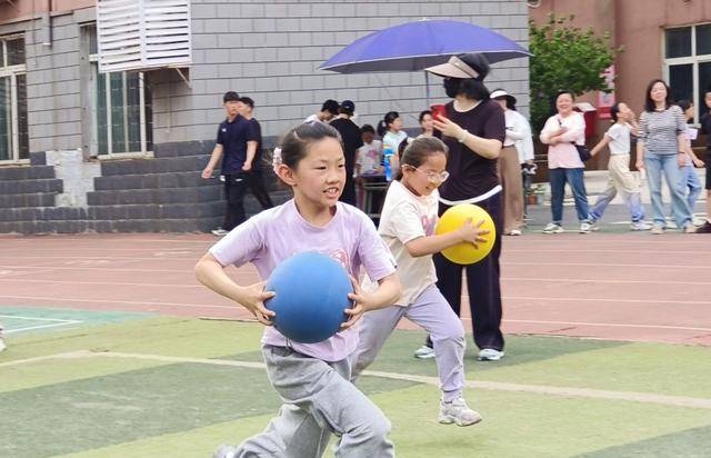 亲子抱球跑:一二年级学生与家长携手完成抱球接力,萌娃与家长配合默契,赛道上笑声与欢呼声交织,传递家庭温情。